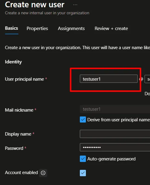 — user-principal-name testuser1@<yourdomain>.onmicrosoft.com \