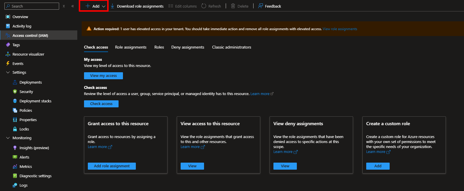 Navigate to Subscriptions → Access Control (IAM) → + Add Role Assignment.