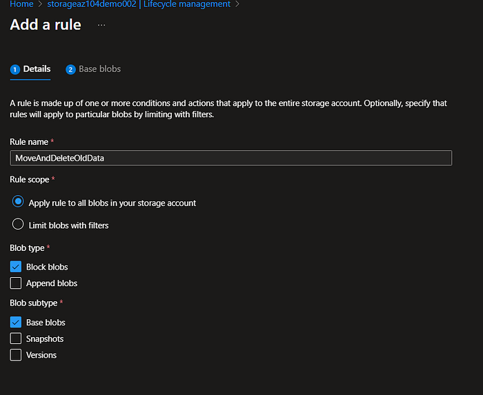 MoveAndDeleteOldData - Scope: Apply rule to all blobs in container “appdata”.