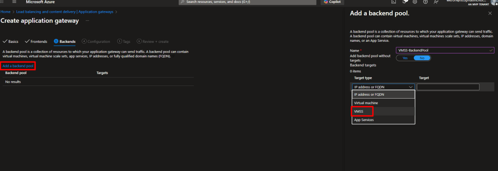 VMSS-BackendPool - Target type: Select “Virtual machine scale set”