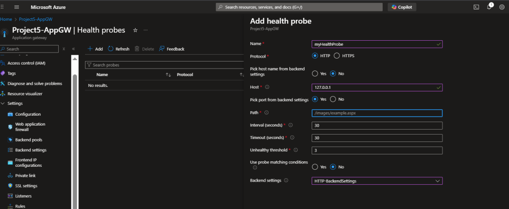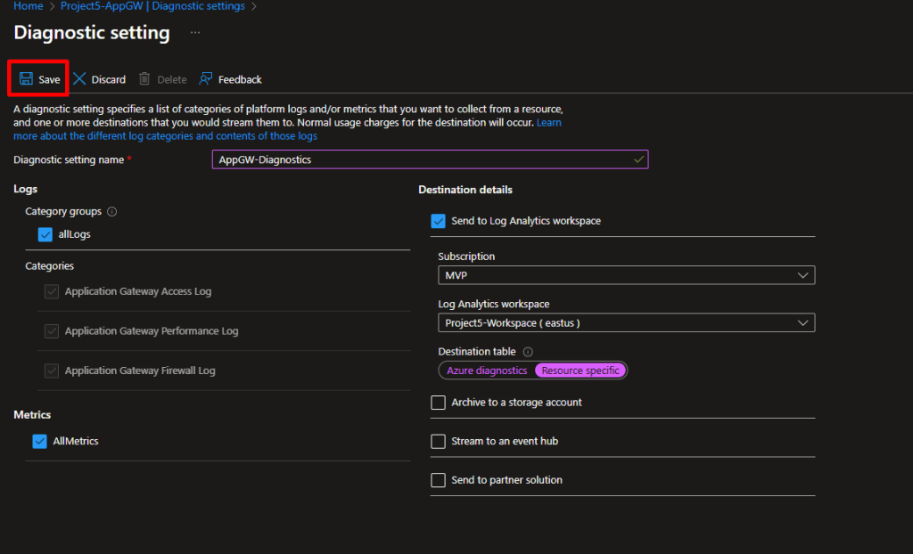 Project5-AppGW) - In the left menu, under Monitoring, click “Diagnostic settings”