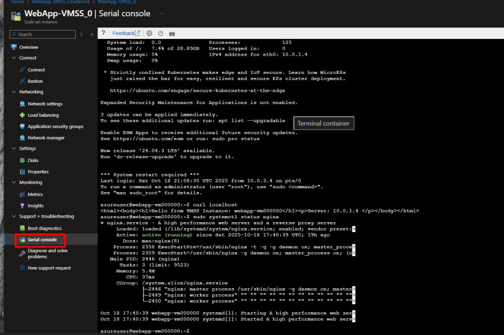 - SSH into one of your VMSS instances (you’ll need to set up a bastion host or add a temporary NSG rule allowing SSH)