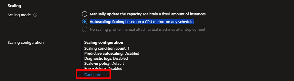 4. Scaling tab: select Autoscaling: Scaling based on a CPU metric, on any schedule.