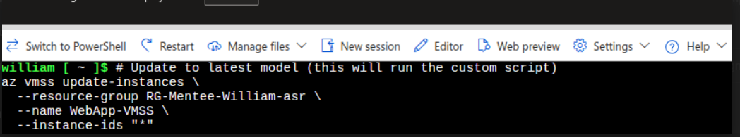az vmss update-instances \ --resource-group <ResourceGroup> \ --name WebApp-VMSS \ --instance-ids "*"