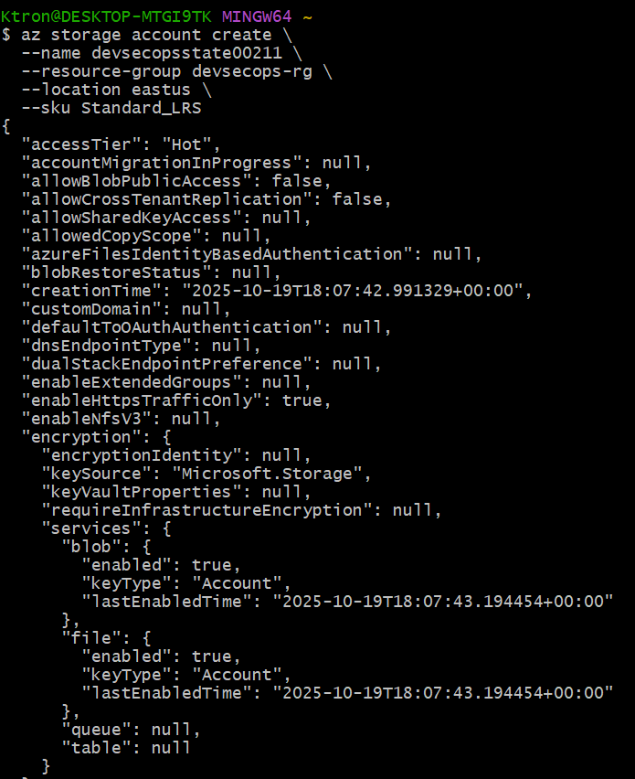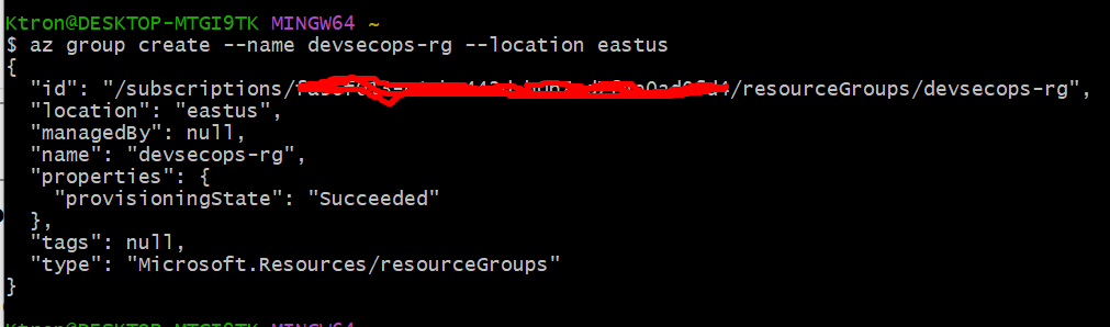 --name devsecops-rg– I named my resource group “devsecops-rg”--location eastus– I chose East US (you can pick a region closer to you)