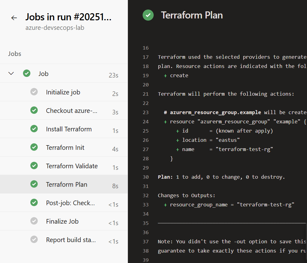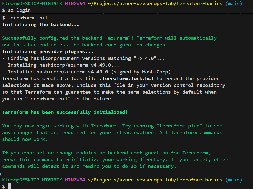 terraform init– Connects to Azure and sets up the backendterraform plan– Shows what Terraform would do (but doesn’t actually do it)