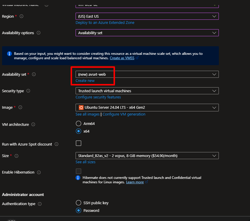 - Availability Options: Select “Availability Set” → Create new → Name: