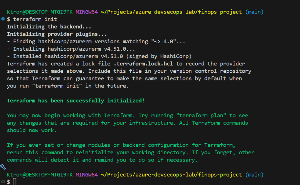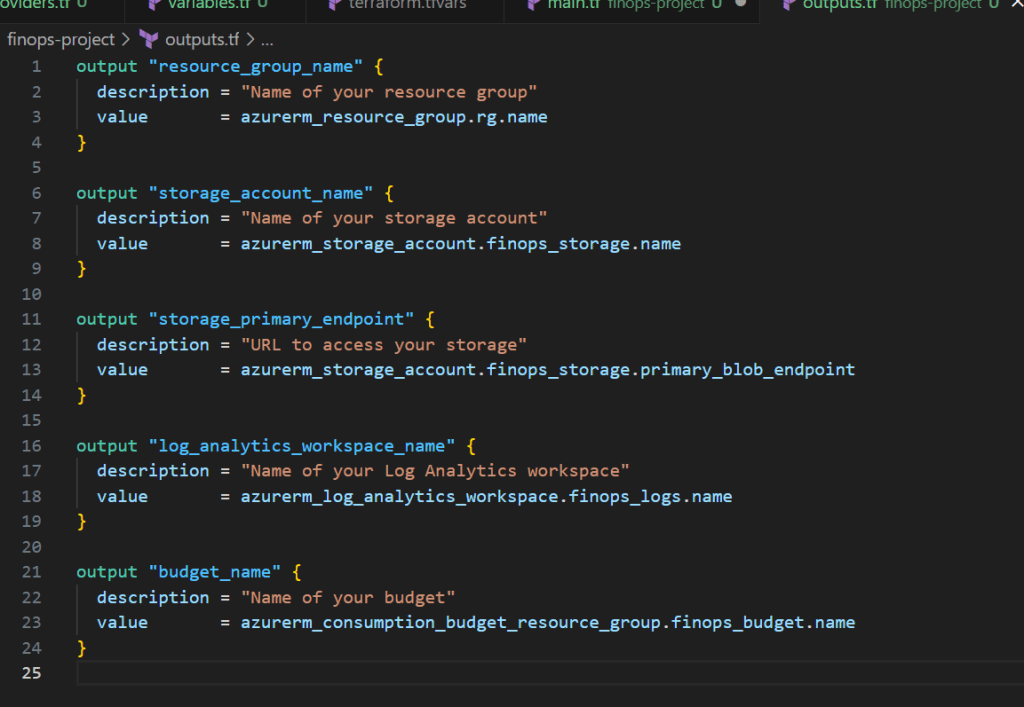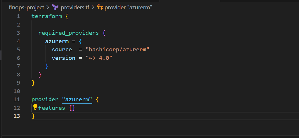 What this does: Tells Terraform “Hey, we’re going to build stuff in Microsoft Azure.”
