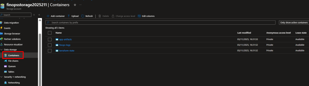 mystorageacct2025) - On the left menu, click “Data storage” → “Containers”
