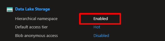 - Verify “Hierarchical namespace” says “Enabled”
