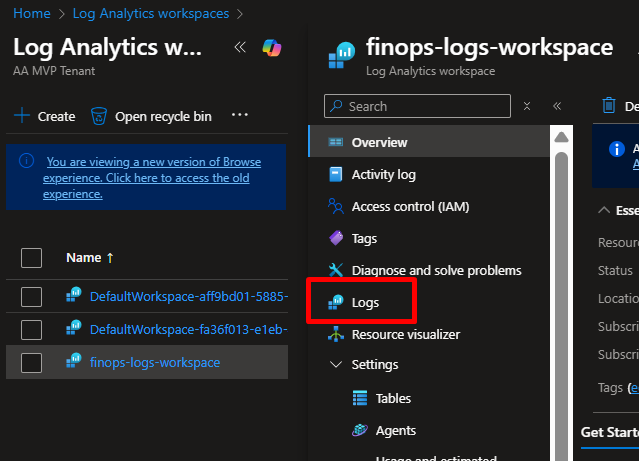 finops-logs-workspace) - Click “Logs” in left menu