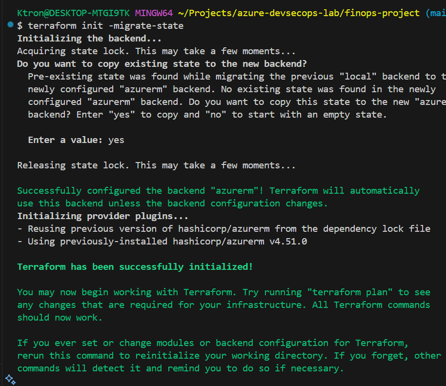 Now that storage is created, let’s move Terraform state to the cloud: