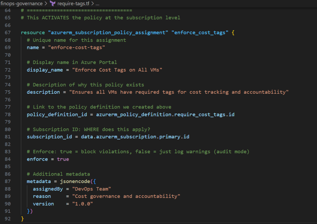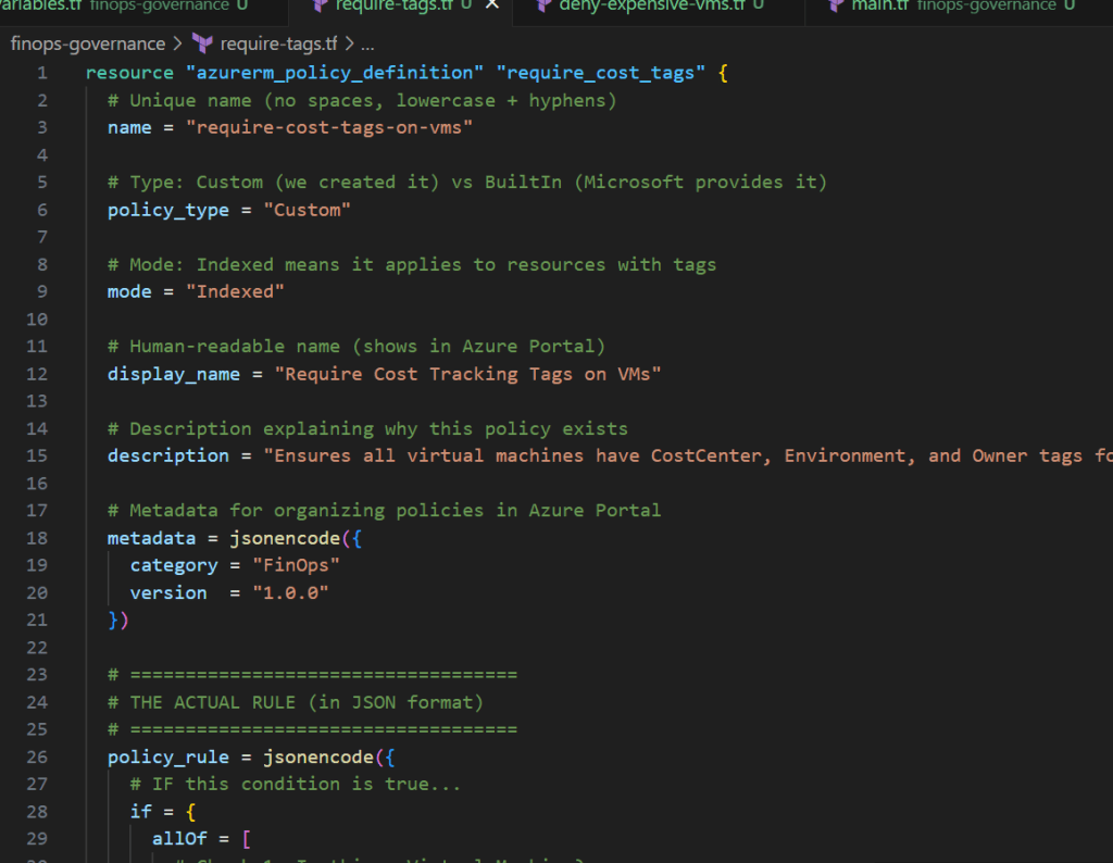 Learning that cost control isn’t just a finance thing, it’s a DevOps responsibility. Using Terraform and Azure Policy, I automated governance so no resource slips through without a tag. It felt like I was bringing real discipline into the cloud just like CI/CD, but for cost control.
