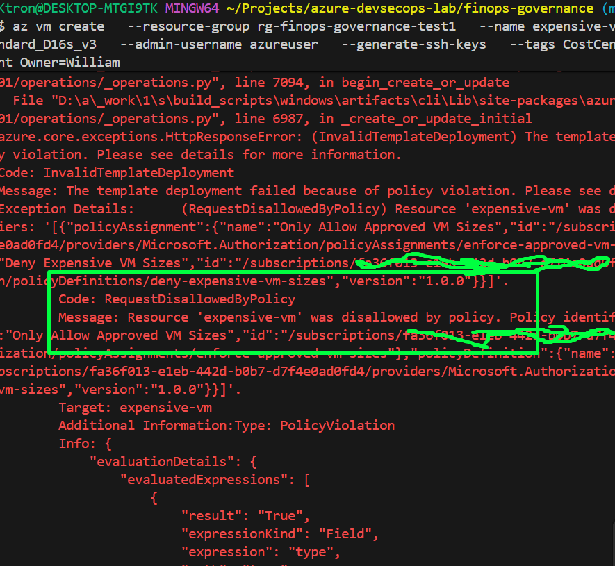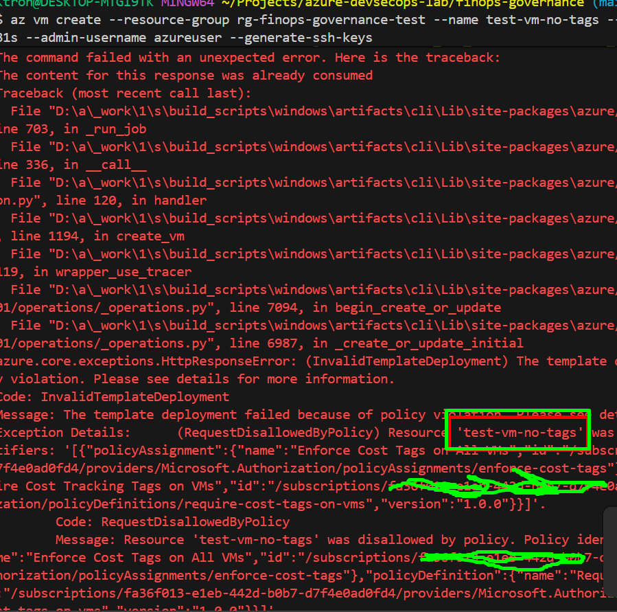 az vm create --resource-group rg-finops-governance-test --name test-vm-no-tags --image Ubuntu2204 --size Standard_B1s --admin-username azureuser --generate-ssh-keys