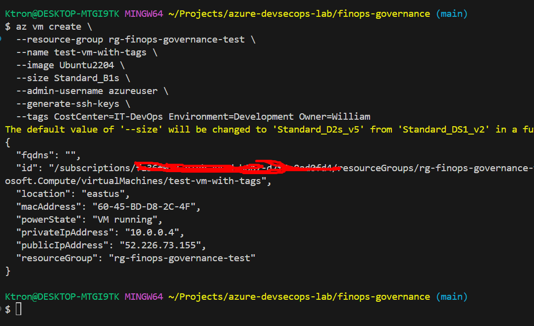 az vm create --resource-group rg-finops-governance-test --name test-vm-no-tags --image Ubuntu2204 --size Standard_B1s --admin-username azureuser --generate-ssh-keys