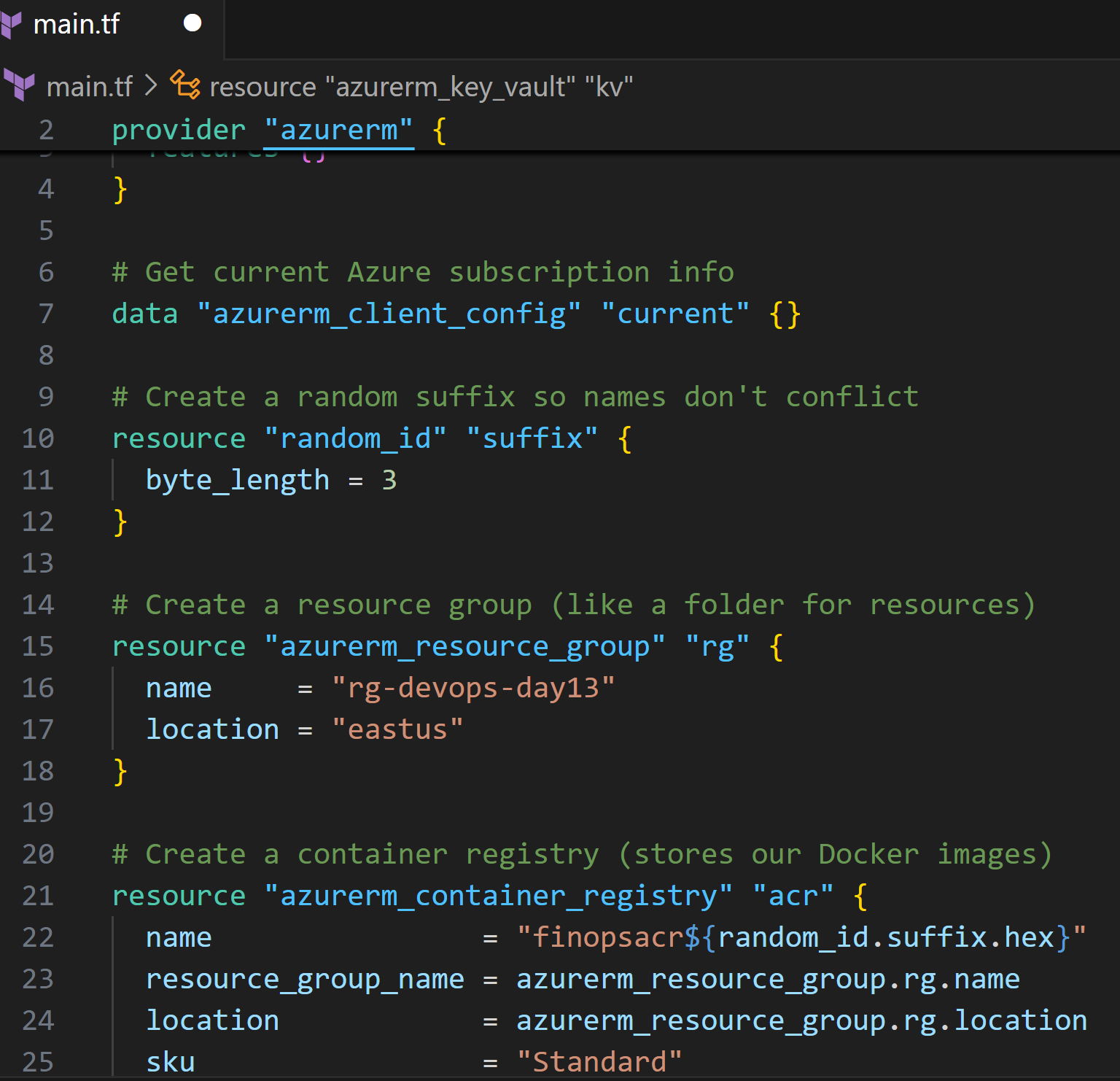 What is Terraform? It’s like writing a recipe for your cloud infrastructure. Instead of clicking around the Azure portal, you write code that says “I want these resources” and Terraform creates them.